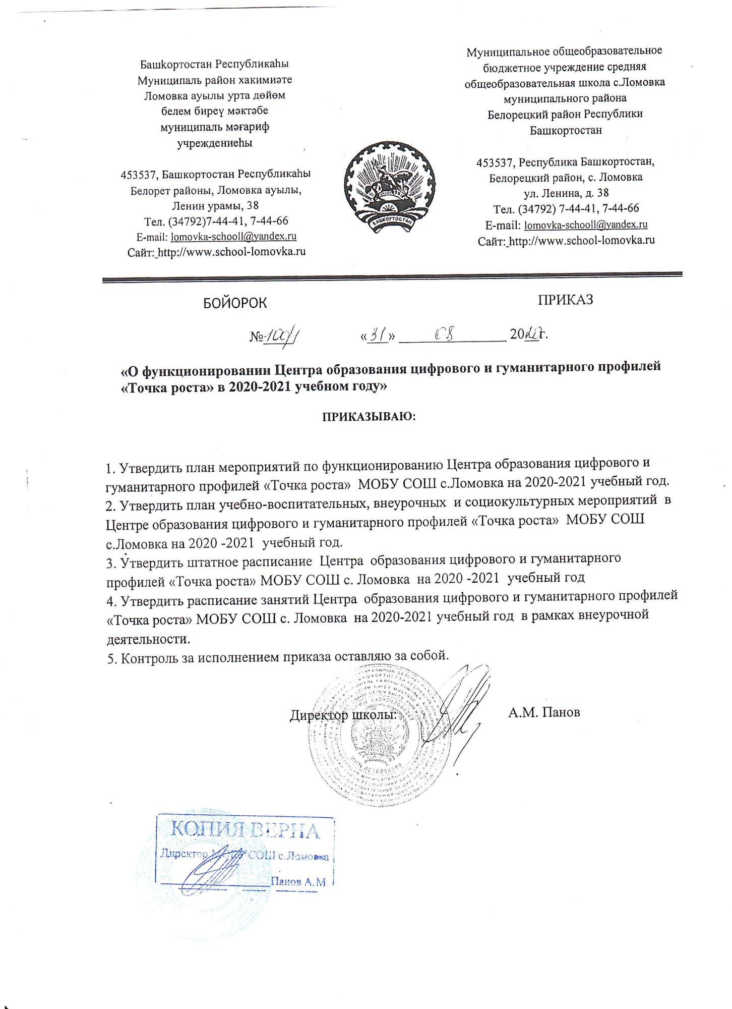 Приказ “О функционировании Центра образования на 2020-2021 уч год”