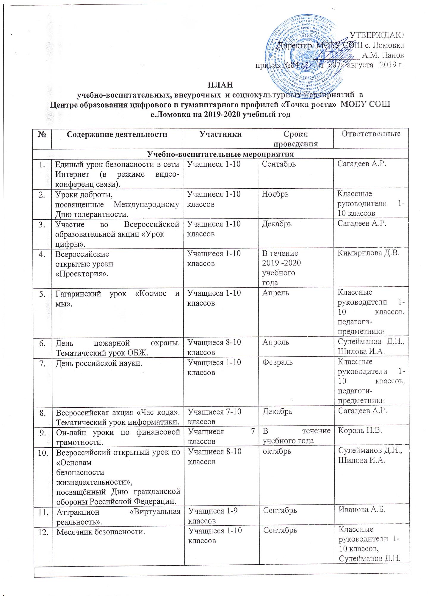 План мероприятий по созданию и функционированию Центра образования цифрового и гуманитарного профилей Точка роста