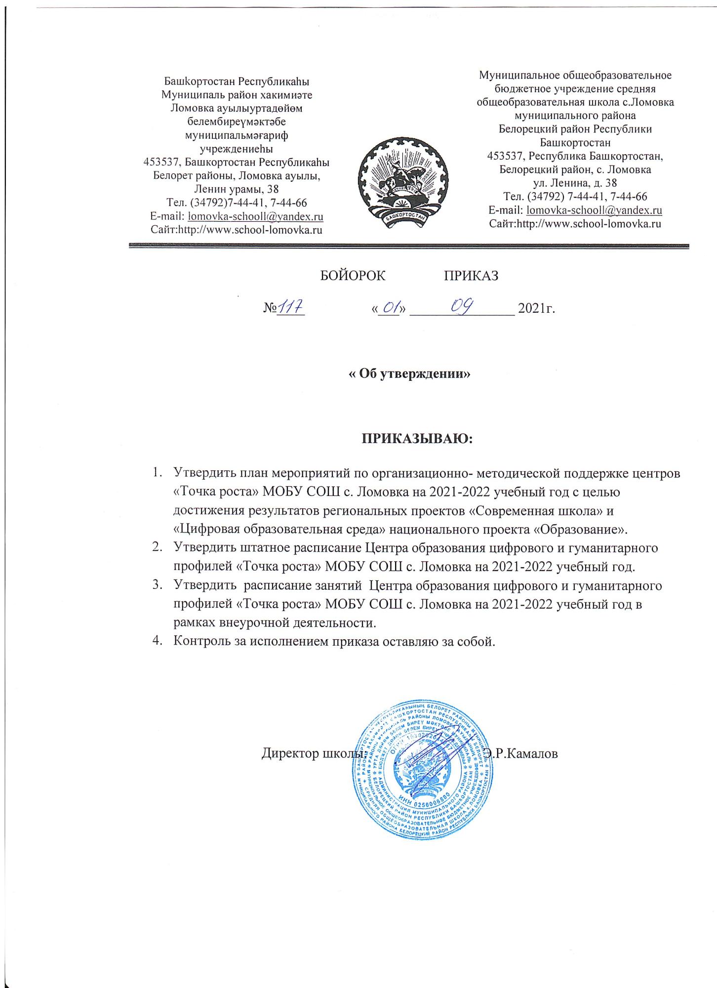 Приказ “Об утверждении Центра образования на 2021-2022 уч год”